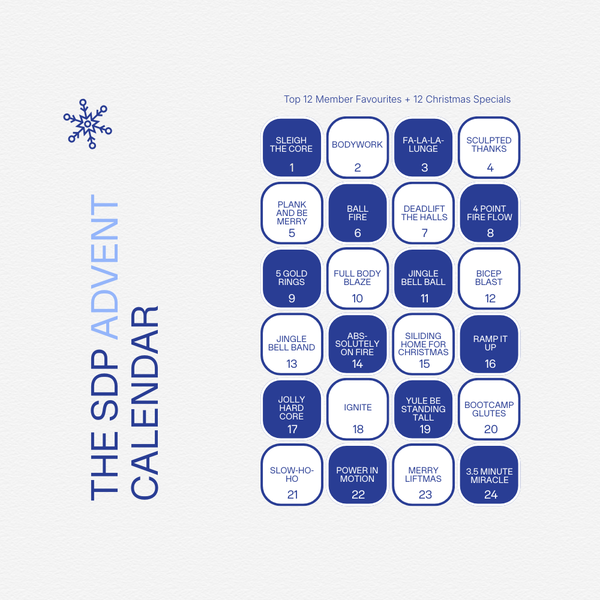 Inside your 24-day Christmas countdown, you’ll get a smart mix of full-length strength sessions and short festive classes, designed to work with your month — not against it.